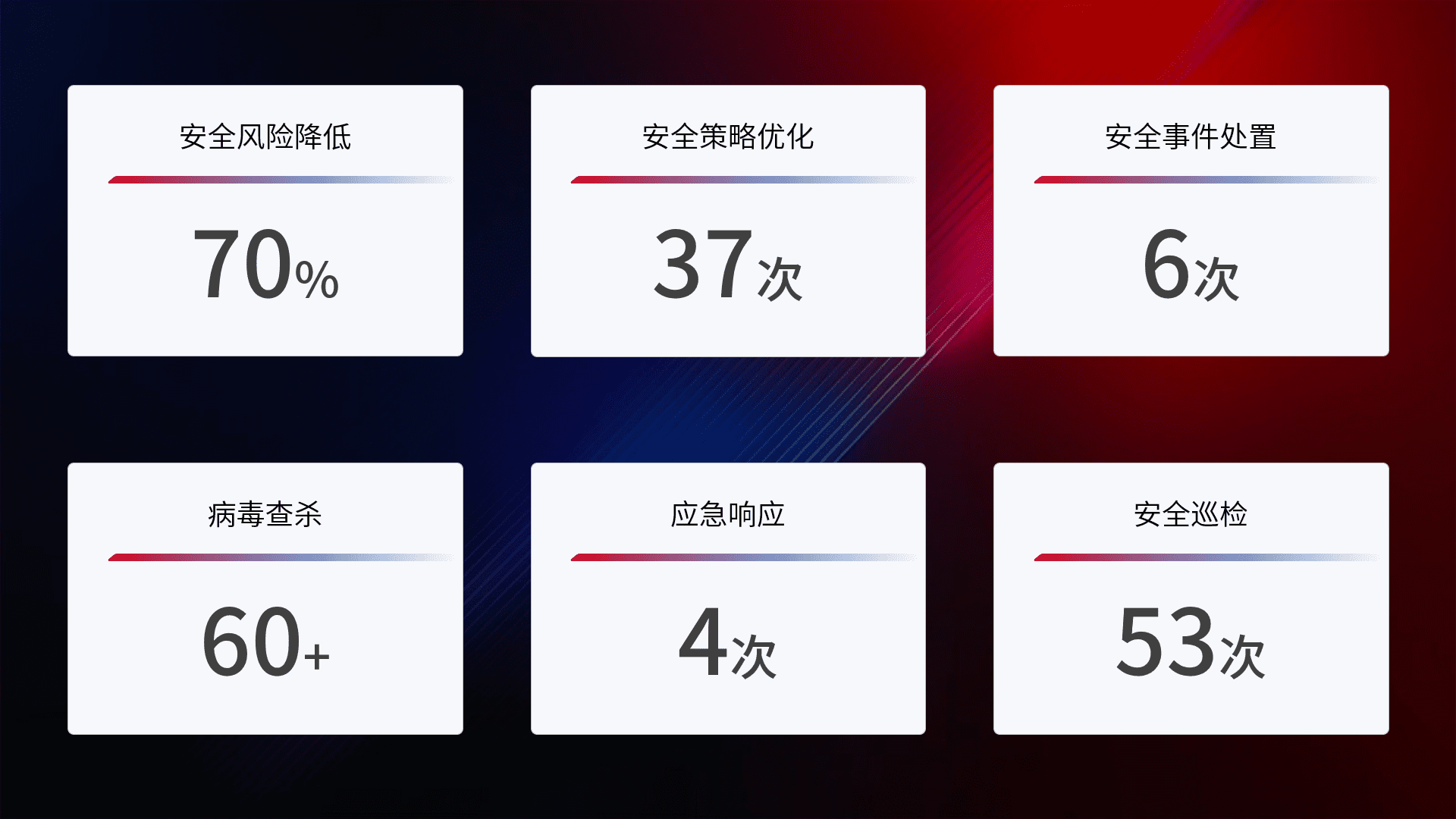 提供全面的安全事件报告体系,,包括处置报告、、、周报、、、季度和年度总结,,结合持续监控,,,,帮助客户深入了解网络安全状况。。。。